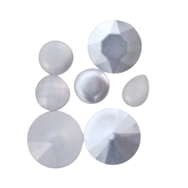 Faceta: Meia bola / pérola lisa (pedra da lua) ou facetada, chapado, rivoli, quadriculado. Para um mesmo formato / medida podem haver facetas diferentes.