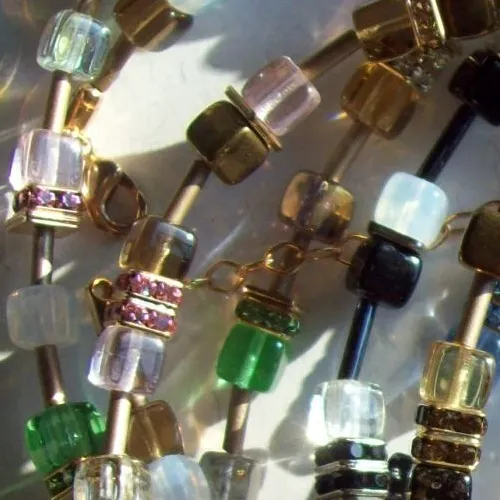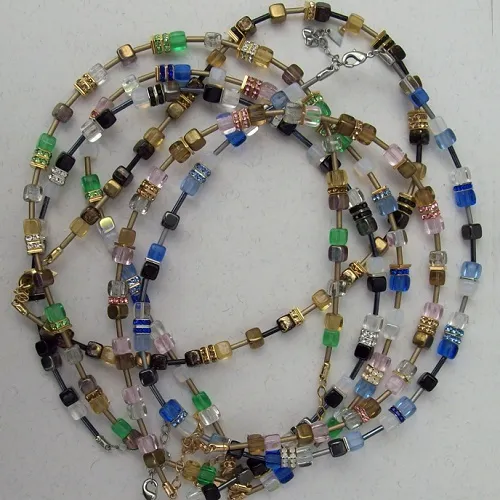 - Pedras intercaladas com canutilho de metal banhado em dourado ou prata, variando de acordo com o modelo.