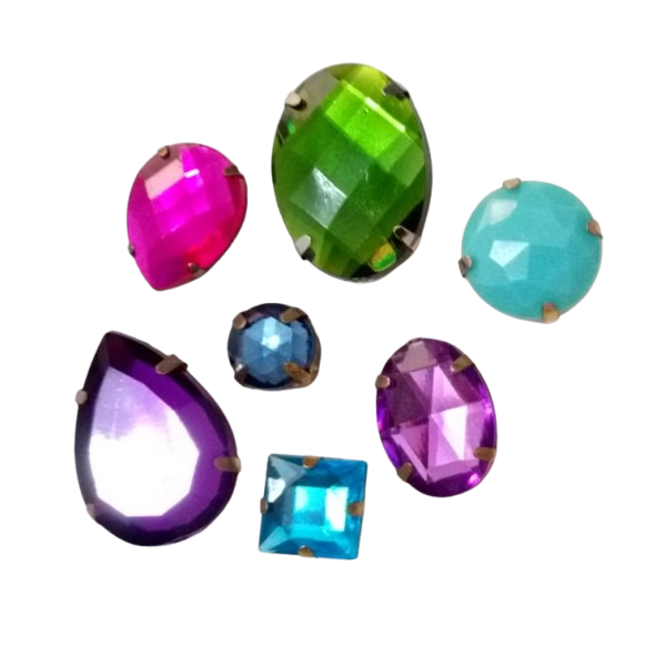 Caixa em metal com pedra acrílica, furos laterais ou inferiores para costura de bordados na customização de roupas e acessórios de moda.